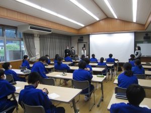 4月26日(水)第5校時に人権擁護委員協議会から髙野様、加藤様、湯本様の3名を講師にお迎えし、人権教室を実施しました。生徒はいじめに関するビデオを視聴した後、講師による谷川俊太郎氏の詩「ともだち」の朗読に聞き入っていました。いじめに立ち向かう勇気、友達を大切にする気持ち、協力し合う心などについて、それぞれが静かに思いを巡らせることができ、とても有意義な時間になりました。