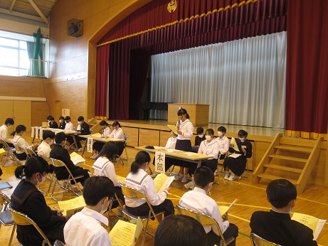 5月26日(金)第6校時に、令和5年度の生徒総会が開かれました。生徒会本部や各委員会の活動内容について、たくさんの質問や意見が出され、担当者が真摯に答弁していました。生徒会が目指す、「行動皆志 ~一人一人がのびのびと過ごせる学校~」づくりへの第一歩となりました。