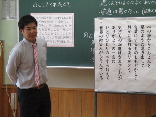 5月29日(月)に3年B組で、本田教諭による道徳科の研究授業を行いました。授業では東日本大震災のエピソードを題材に用い、「ありがとう」の言葉がもつ意味や奥深さについて、じっくりと考えさせました。授業の終末には、生徒が実体験したエピソードを使い「思いやり・感謝の木」に花を咲かせることができました。授業参観していただいた荒川東小の先生方、ご指導いただいた義務教育指導課 芳賀一行 先生、北部教育事務所 逸見梓 先生、秩父市教育研究所 飛川成正 先生、大変ありがとうございました。