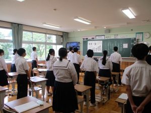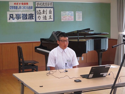 7月19日(水)暑さ対策のため急遽オンラインに変更し、無事に1学期終業式を行うことができました。各学年代表者の言葉では、学習や部活動など学校生活の思い出や反省について、友達の思いも代弁しながら、しっかりと振り返ることができていました。どの学年も、4月から確実に成長していることがうかがえました。36日間の夏休みで英気を養い、始業式には元気な姿で会えることを楽しみにしています。
