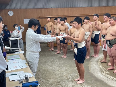 11月10日(金)上尾市の県立武道館に於いて、新人戦(相撲)の県大会が行われました。本校から団体戦に出場した6名は、顧問の吉田教諭をはじめ、柔道有段者の教頭や武道家の事務職員にも稽古をつけてもらい、見事三位入賞を果たすことができました。相撲で培った精神を、それぞれが所属する部活動でも役立ててください。団体戦メンバー(2年生):林 匡平、江田 凱和、清水 典征、平 星音、吉野 裕人、新井 颯太