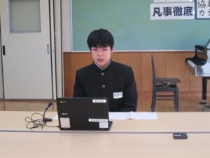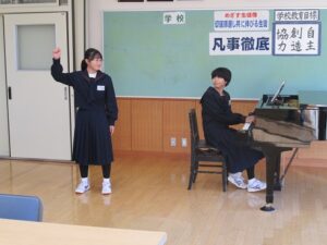 令和6年1月9日(火)今シーズン一番の寒さの中、3学期が無事スタートいたしました。プールの水も凍ってしまう寒さでしたが、多くの生徒は元気な姿を見せてくれました。始業式では校歌斉唱(指揮 渋沢莉央、伴奏 新井瑠七)のあと、1年生代表 木村心さん、3年生代表 石森友梧さん(2年生代表は欠席)から力強く新年の抱負が述べられました。その後、能登半島の震災や羽田空港での飛行機事故でお亡くなりになった方々に黙祷を捧げました。この場を借りて被害に遭われた皆様にお見舞いを申し上げるとともに、亡くなられた方々へは、心よりご冥福をお祈りしたいと思います。
