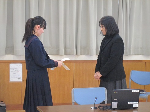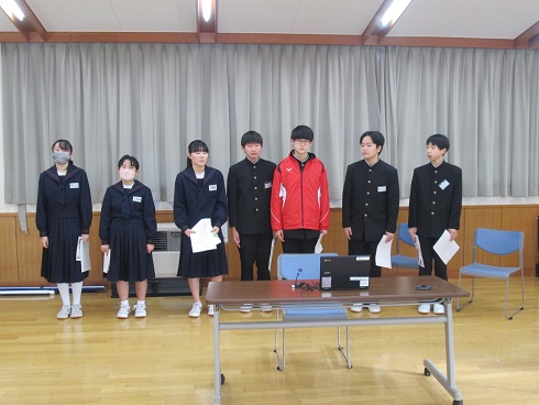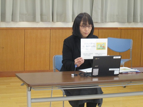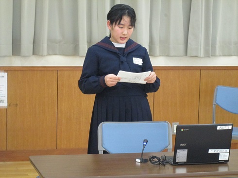 令和6年1月29日(月)本日は荒川調理場栄養士の若林様、配膳員の山中様をお迎えし、オンラインで「給食感謝の会」を開きました。給食委員会から世界の給食の紹介が行われ、その後若林様から給食の始まりや、栄養バランスなどについて、クイズ形式でわかりやすくお話いただきました。全校生徒からお二人へ感謝の手紙を渡し、毎日いただいている給食の大切さを感じる会になりました。ご多用の中、早朝からお越しいただいたお二人に感謝申し上げます。