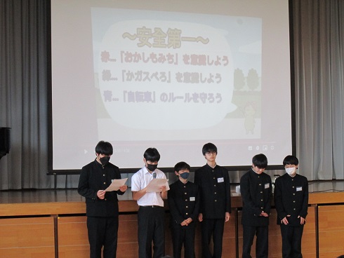 令和6年5月13日(月)今朝は安全委員会による生徒朝会が行われました。校歌を歌った後に、安全委員会で作成したスペシャル動画が流されました。動画では校内での安全な過ごし方や自転車の乗り方、避難訓練での注意事項などについて良い例と悪い例が示され、大変わかりやすくまとめられたいました。動画の内容を意識して、安全で安心な学校生活を送ってほしいと思います。