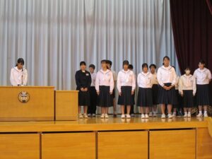令和6年10月7日(月)今朝は2学期に活躍した学習、文化、スポーツの各部門における表彰朝会を行った後に、新人戦県大会に向けた壮行会が行われました。新生徒会が発足して初仕事のため、運営役員には緊張感が漂っていましたが、生徒会長の激励の言葉、各部代表者の意気込み、校長からの激励の言葉と続き、温かな拍手に包まれた壮行会を実施することができました。出場する選手には、荒中生としての誇りを胸に秘め、力を尽くしてきてくれることを期待しています。新人戦県大会出場部:陸上女子200m、剣道女子個人、卓球男子シングルス、ソフトテニス女子個人、相撲男女