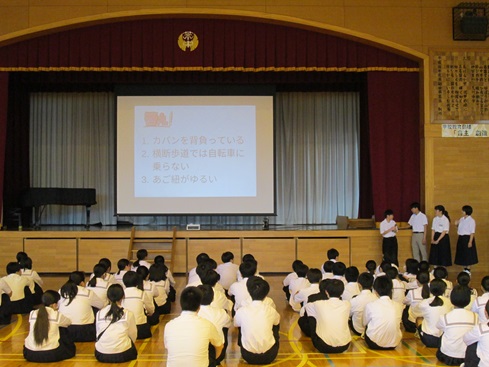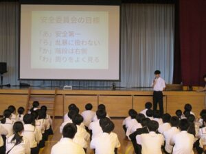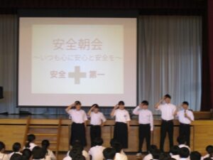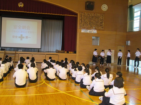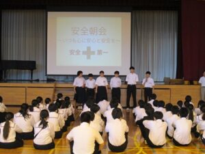 令和7年6月16日(月)今朝の生徒朝会は、安全委員会の発表でした。自転車の乗り方をはじめ、地震などの緊急時の対応の仕方、廊下や階段の通行ルールなどについて、スライドと実演を交えて発表してくれました。梅雨の時期は廊下が滑りやすかったり、道路の見通しが悪くなったりすることがあります。安全を意識して、安心して学校生活を送ってほしいと思います。