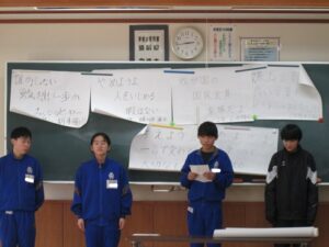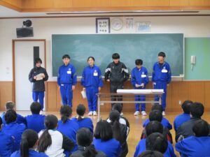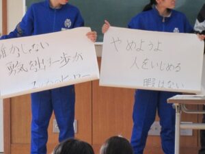 令和7年12月8日(月)今月は人権週間ちなんで、学級委員会で生徒集会を開き、学級委員会のスローガン発表と、全校で募集した「いじめ撲滅宣言」の発表を行いました。各学年から2点ずつ選出された、選りすぐりの作品を校内に掲示し、いじめ撲滅に向けて啓発に取り組みます。これからもいじめのない、人に温かな学校であり続けてほしいと思います。