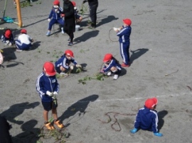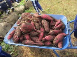 プール前の畑へ6月にさつまいもの苗さしをしておいたものです。掘る前に、あらかじめ職員がさつまいもの蔓切りをしておきました。