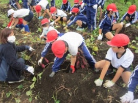 4時間目は、いも掘りを行いました。一人一人が掘りおこしてみると、大きなおいもを掘りあてる子もいて、歓声を上げる子もいました。掘ったおいもは、お家に持ち帰ります。お家で味わっていただければ幸いです。