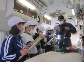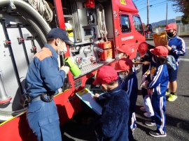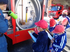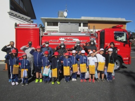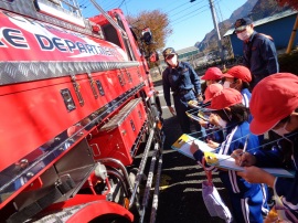 11月16日に、3年生が学校近くの秩父消防署南分署へ社会科の学習の一環で見学に行きました。2班に分かれ、DVDを見せてもらったり、説明してもらったりしました。また、隊員の方が消防服を着るところを見せてくれたり、救急車の中や消防車を見せてもらったりもしました。他に、水消火器の体験を全員がさせてもらいました。中身の濃い、一時間となりました。