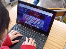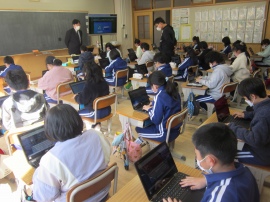 1・2校時に、4年生が株式会社スプリックスの鳥巣様をお招きし、プログラミング教室の授業を受けました。それぞれのタブレットを使用し、キャラクターを動かす作業を行ったり、タイピング練習を行ったりしました。