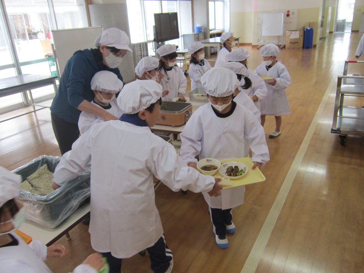 4月14日(金) 今日から1年生も給食が始まりました。みんなで協力して配膳をしました。おいしい給食をたくさん食べて大きくなってくださいね。