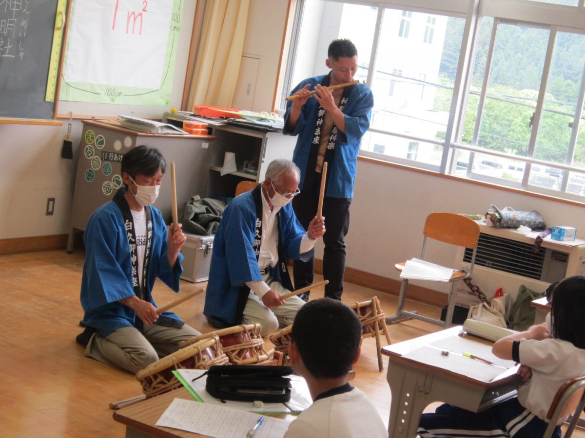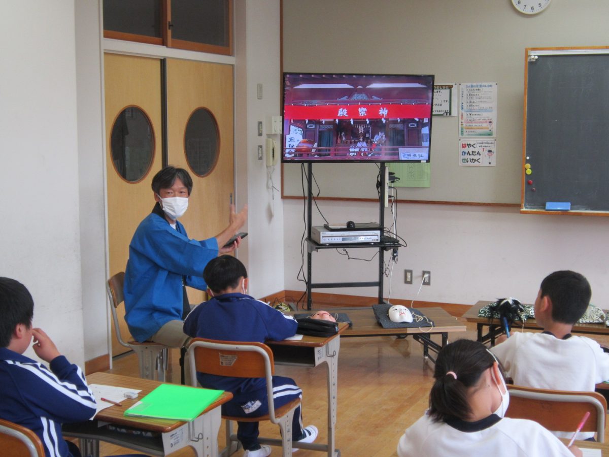 4年生が総合的な学習の時間で神楽体験学習を行いました。神明社 白久御神楽座の皆様にお越しいただき御神楽についてお話をしていただきました。DVDで映像を見せていただいたり、笛や太鼓を演奏していただいたり、さらには、実際にお面をかぶらせていただいたりと充実した学習となりました。本日はお忙しいところ神明社の皆様、たいへんありがとうございました。