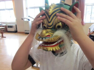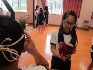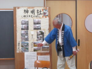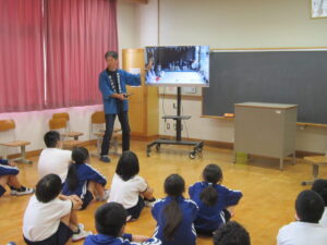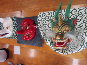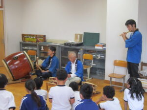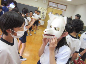 4年生が総合的な学習の時間で神楽体験学習を行いました。神明社 白久御神楽座の皆様にお越しいただき御神楽についてお話をしていただきました。VTRで映像を見せていただいたり、笛や太鼓を演奏していただいたり、さらには、実際にお面をかぶらせていただいたりと充実した学習となりました。本日はお忙しいところ神明社の皆様、たいへんありがとうございました。