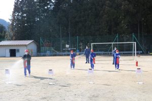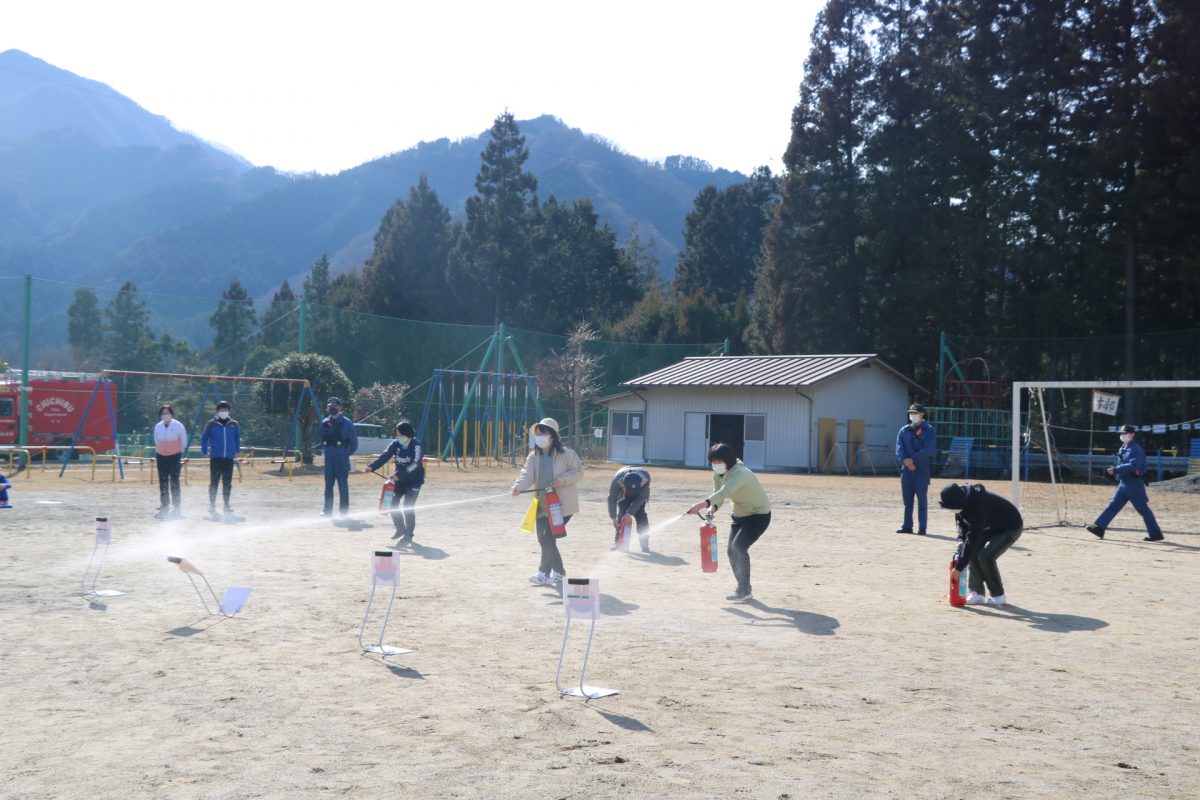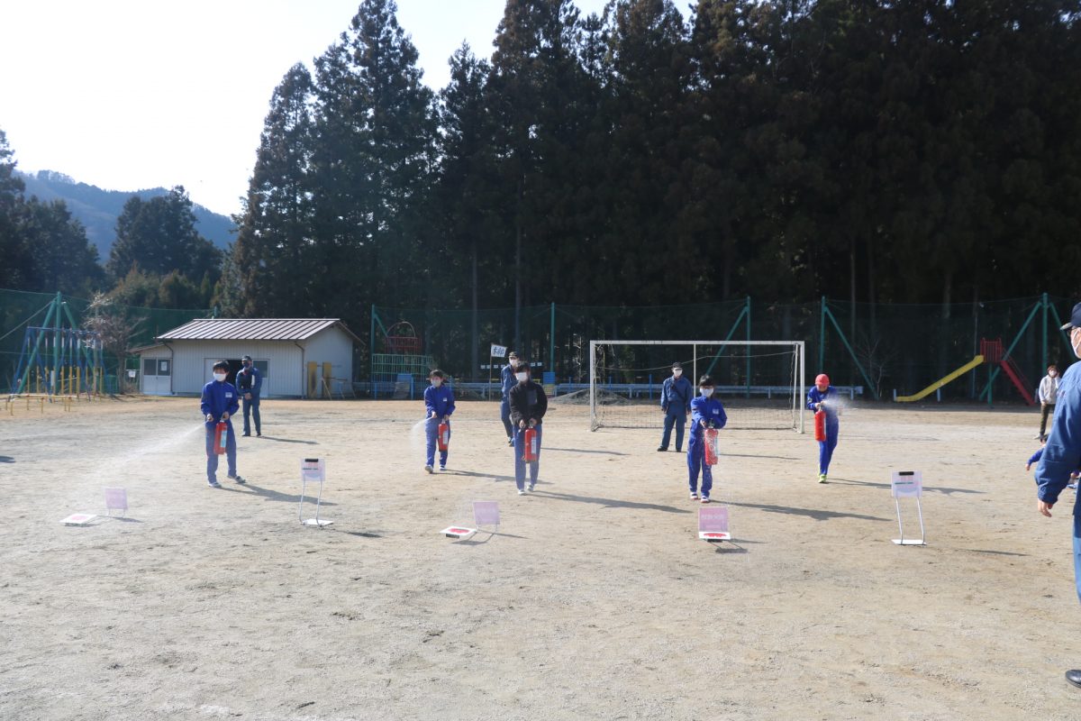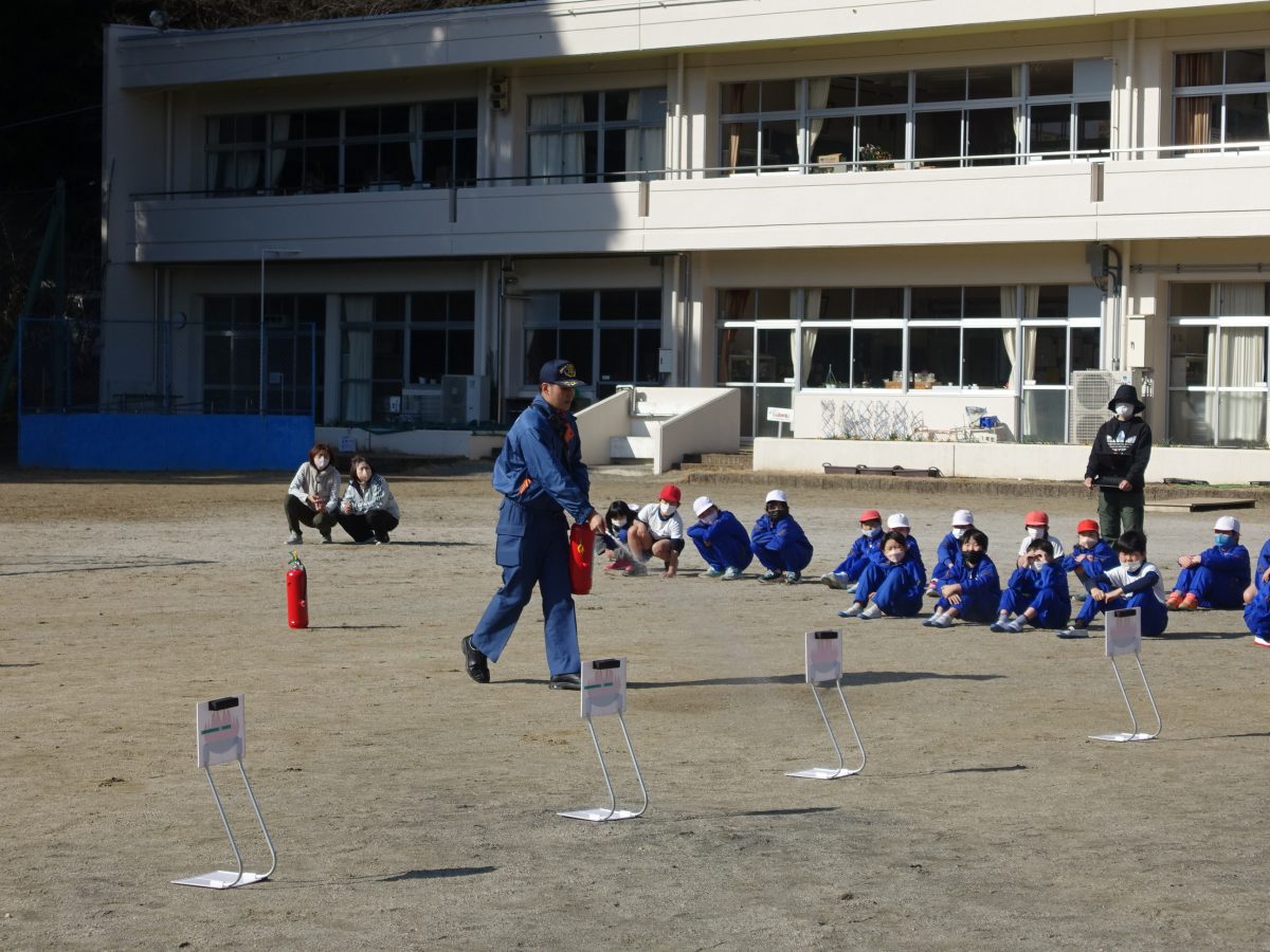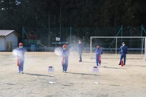 避難訓練のあと、消防隊のみなさんに消火器の使い方を教わり、教職員と5・6年生は消火訓練を行いました。