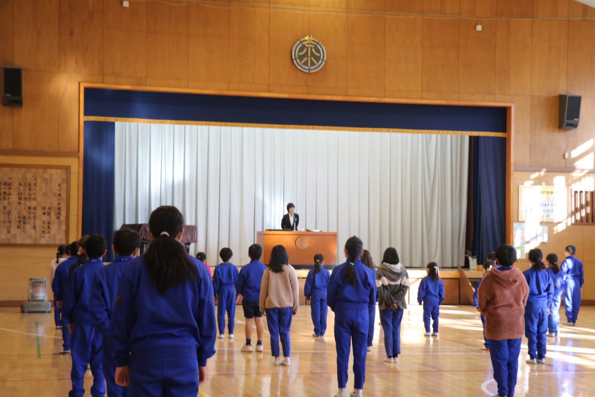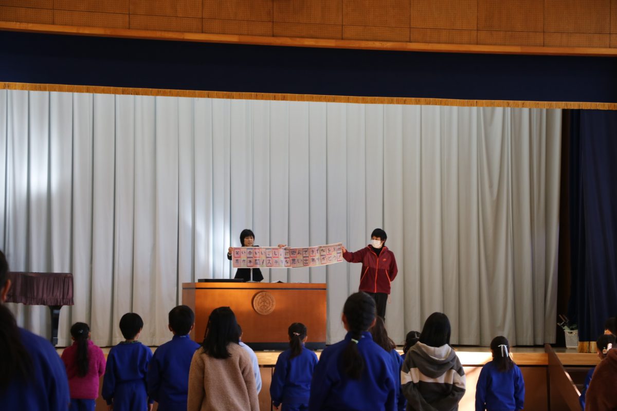 6年生の教室にある、「笑い合いいっしょに遊んできずなを深めた六年間!ステキな思い出ありがとう!」という一文字一文字が半紙に書かれている掲示物の話がありました。ここには六年生の仲間を含め、下級生や今は中学校にいる上級生、先生方への思いも込められているというお話をしていただきました。また、尊敬と感謝の気持ちをもつことを大切にしましょうというお話をしていただきました。感謝の気持ちはもつだけでなく、積極的に表現するようにしましょう。