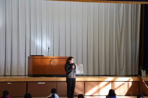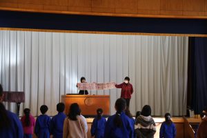 次に岩嵜先生から3月の月めあて「一年間をふり返って学習面・生活面の反省をしよう」についてお話がありました。今週は一斉漢字テスト・計算テストがあります。頑張りましょうというお話でした。