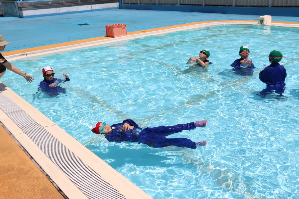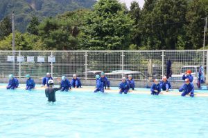 7月3日(月)1~4年生が着衣泳を行いました。水着の上にジャージを着て、靴を履き、プールに入る体験をしました。児童たちは「服が重いー!」と話していました。水中で体を浮かす方法や、ペットボトルを使って体を浮かす方法を学びました。