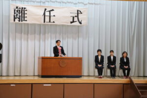 4月18日(金)3月までお世話になった先生方をお迎えし、離任式を行いました。子どもたちは思い出のこもった感謝のお手紙と花束を渡した後,懐かしい先生の指揮で元気よく校歌を歌いました。お別れの前に,自由に先生方とお別れをし楽しい思い出を作ることができました。