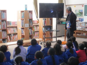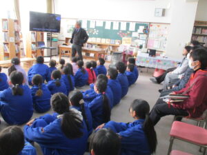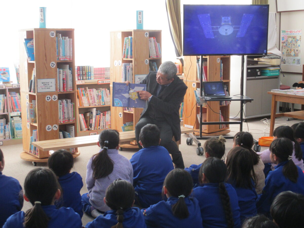 小惑星探査機の『はやぶさものがたり』(今井なぎさ・文)を読んでくれました。お話の前後に映像を使い、子どもたちはとてもイメージしやすかったと思います。どんな困難なことがあっても諦めず地球に帰還をはたした「はやぶさ」。子どもたちはとても静かに聞き入っていました。この本は子どもたちが自由に読めるよう図書室にかりてあります。