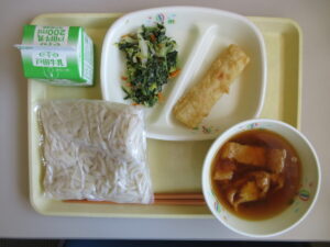 地粉うどん、きつねうどん、いかの天ぷら、ごまあえ、牛乳