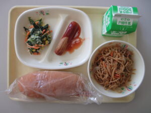 減量コッペパン、焼きそば、ウィンナーケチャップソース、コーンとほうれん草のサラダ、牛乳