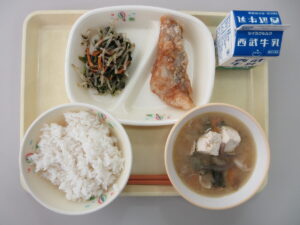 ごはん、豚汁、白身魚のカボスソース、磯香あえ、牛乳