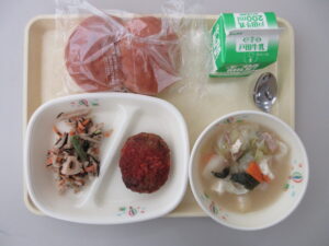 はちみつパン、豆腐と野菜のコンソメスープ、煮込みハンバーグ、ごぼうサラダ、牛乳