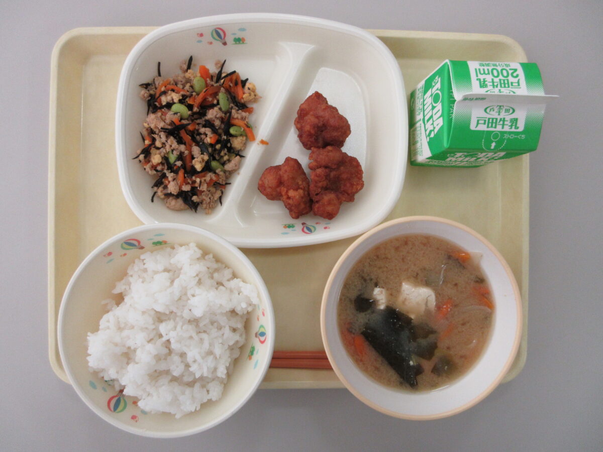 【本日のメニュー】*重陽(ちょうよう)の節句献立ごはん、秋なすのみそ汁、鶏肉の唐揚げ、ひじきのそぼろ炒め、牛乳*9月9日は重陽の節句です。3月の桃の節句、5月の端午の節句のように、5節句の一つです。古くから「9日(くんち)になすを食べるとかぜをひかない」という言い伝えがあり、重陽の節句になすを食べる習慣が由来とされています。旬の味覚を楽しみながら重陽の節句を祝いましょう。(秩父第一中学校協同調理場一口メモより)