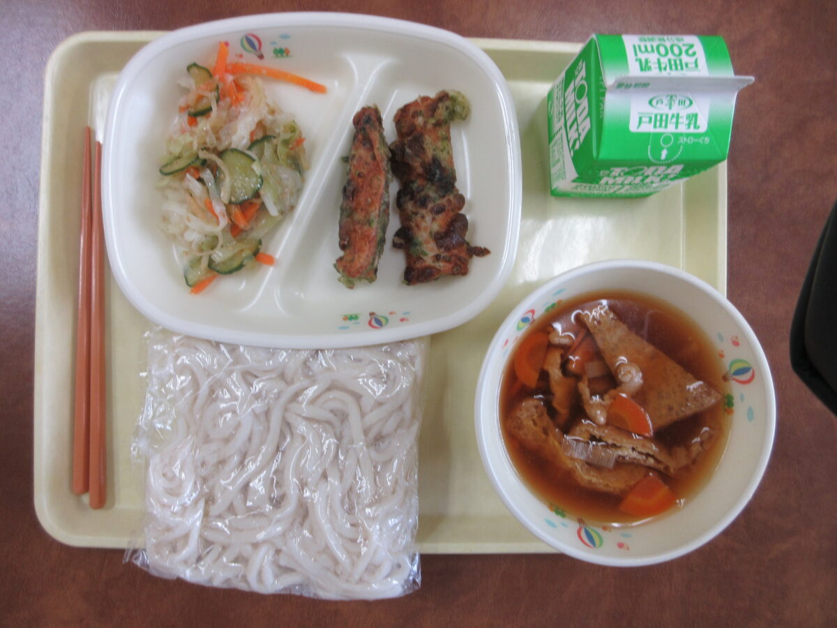 地粉うどん、きつねうどん、竹輪の磯辺揚げ、たくあんあえ、牛乳