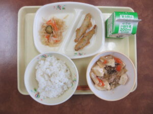 ごはん、豆腐のうま煮、わかさぎフリッター、中華サラダ、牛乳