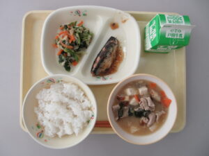 【本日のメニュー】*目の愛護デーごはん、ランドルト環豚汁、いわしのみぞれ煮、ごまあえ、牛乳*今日は目の愛護デーにちなんだ献立です。「ランドルト環豚汁」の「ランドルト環」とは、何かわかりますか?視力検査をするときの「C」のようなマークのことです。ちくわをランドルト環に見立てた豚汁です。調理員さんが手作業でカットしてくれました。(秩父第一中学校協同調理場一口メモより)