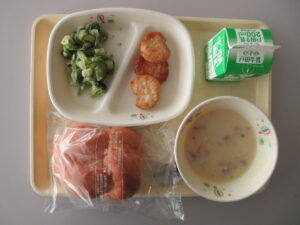 フラワーロール、さつまいものポタージュ、チキンナゲット、グリーンサラダ、牛乳