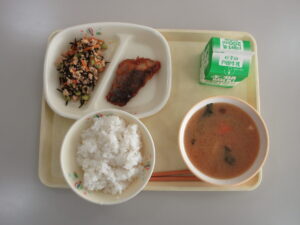 白飯、なめこ汁、白身魚の甘酢あんかけ、ひじきのそぼろ炒め、牛乳