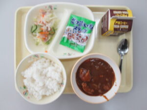 ごはん、チキンカレー、ハムと大根のサラダ、芋けんぴ、牛乳