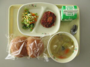 はちみつパン、豆腐と野菜のコンソメスープ、煮込みハンバーグ、チーズサラダ、牛乳