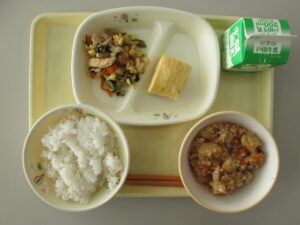 ごはん、じゃがいものそぼろ煮、厚焼き玉子、小松菜とじゃこの炒り煮、牛乳