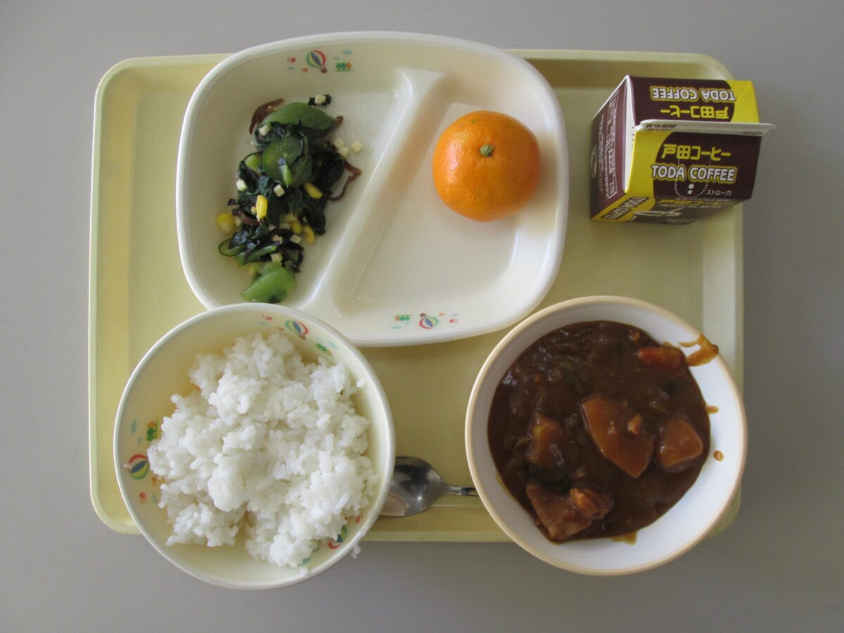 【本日のメニュー】★ふるさと給食の日ごはん、★小江戸カレー、カルシウムサラダ、みかん、コーヒー牛乳★古い町並みや武家屋敷など、江戸時代の面影を残す埼玉県川越市は「小江戸」と呼ばれています。今日のカレーは、川越市の特産品であるさつまいもやほうれん草を使った「小江戸カレー」です。さつまいもの甘みがきいた、いつもとはひと味違ったカレーです。(秩父第一中学校協同調理場一口メモより)