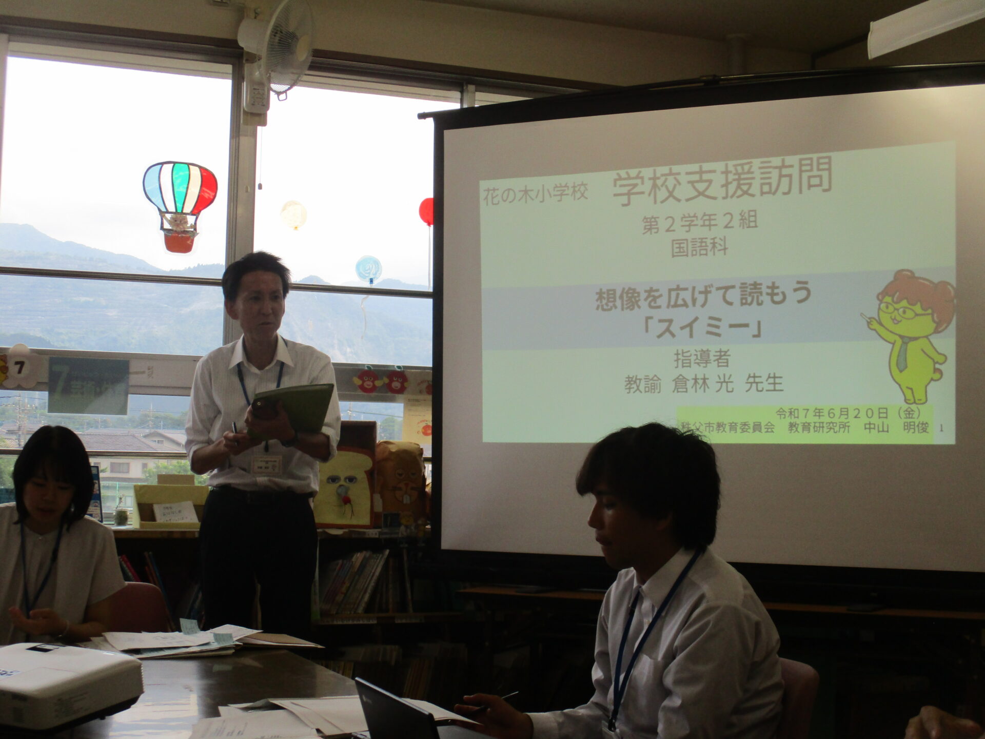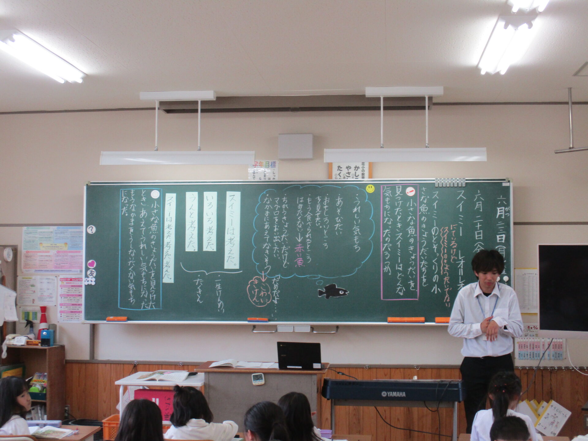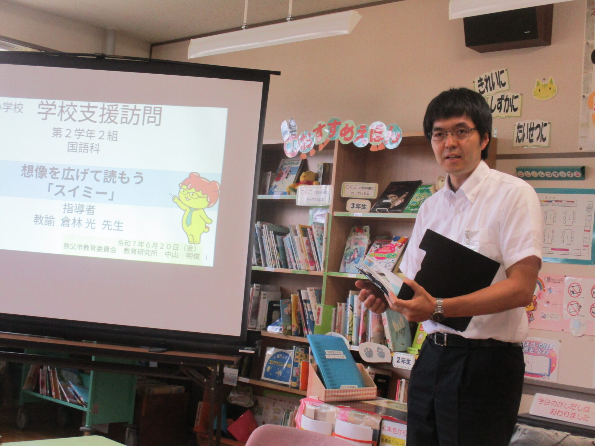 本日は、秩父市教育委員会より、指導者として、指導主事 中山 明俊 様を お招きし2年2組で国語の研究授業を行いました。単元名は、かの有名な「スイミー」。子供たちは少し緊張した様子でしたが、本文を根拠にスイミーの心の変化についてよく考え発表し合っていました。本校では「主体的・対話的で深い学び」を目指す授業展開の工夫を研究主題に掲げ今年度研究を進めております。そして「対話力を向上させ、共に学び合う授業づくりをめざして」おります。研究授業後には、職員の皆さんで研究授業について熱心に協議が行われ、さらに子供たちにとって価値ある授業をするために様々な提案がなされました。最後には、中山 明俊 様から、子供の実態や教育の最新動向を踏まえた非常にていねいでわかりやすいご指導をいただきました。明日からの本校の教育活動に生かしてまいります。大変ありがとうございました。