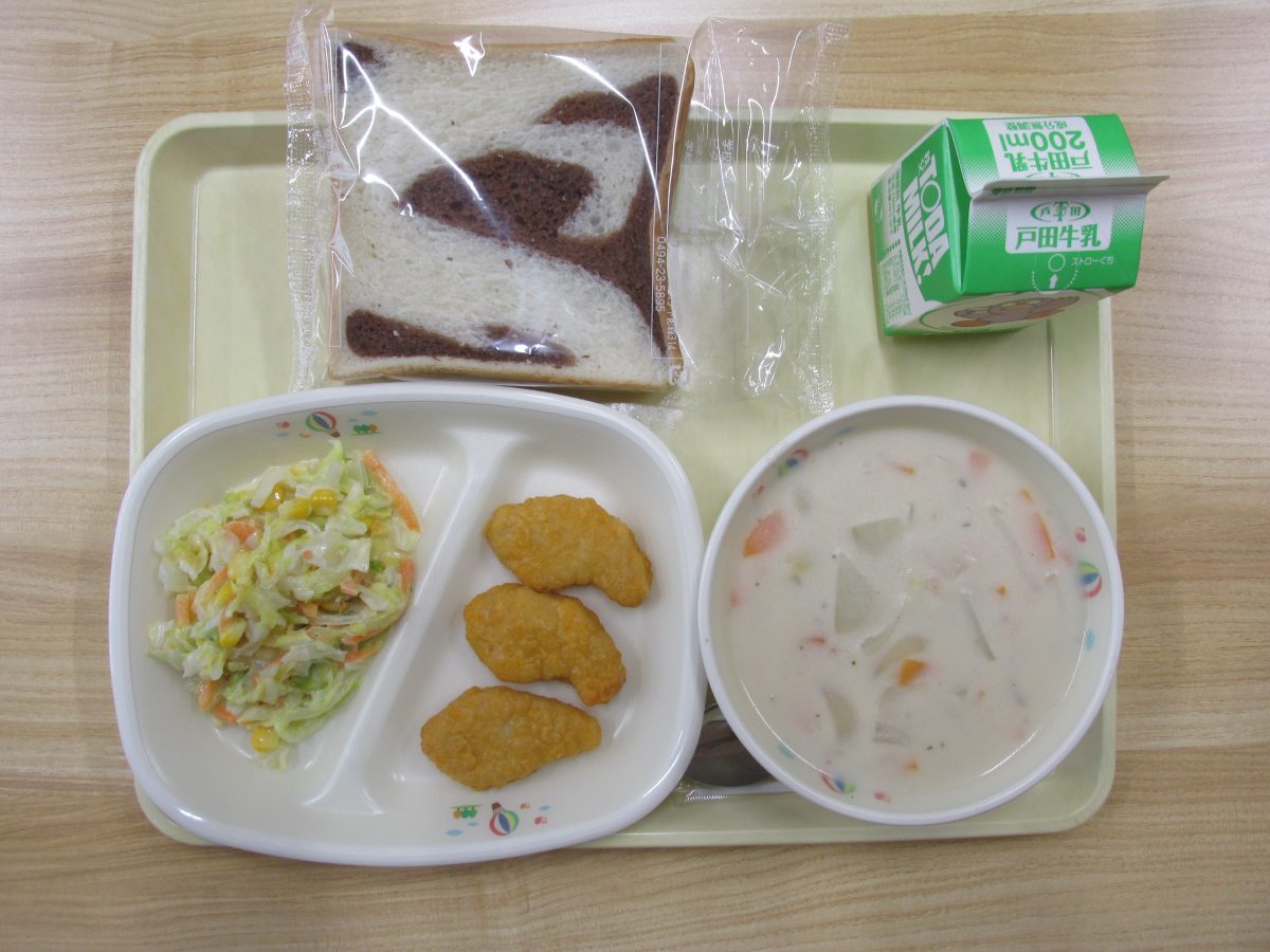 ココアマーブル食パン、チキンナゲット、コールスローサラダ、白花豆のポタージュ、牛乳