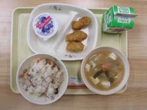 かてめし、白身魚フリッター、みそ汁(豆腐・わかめ)、ハスカップゼリー、牛乳