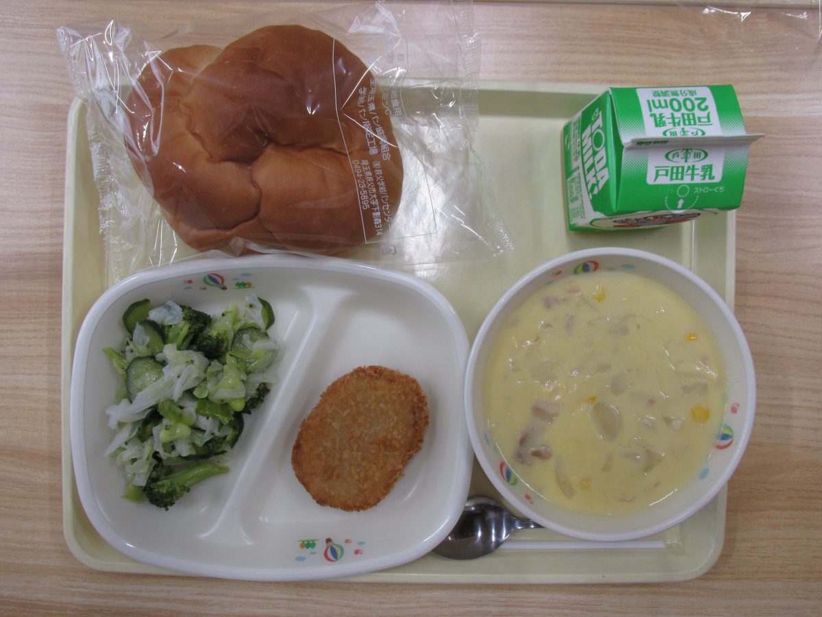 フラワーロール、キャベツメンチカツ、グリーンサラダ、コーンポタージュ、牛乳