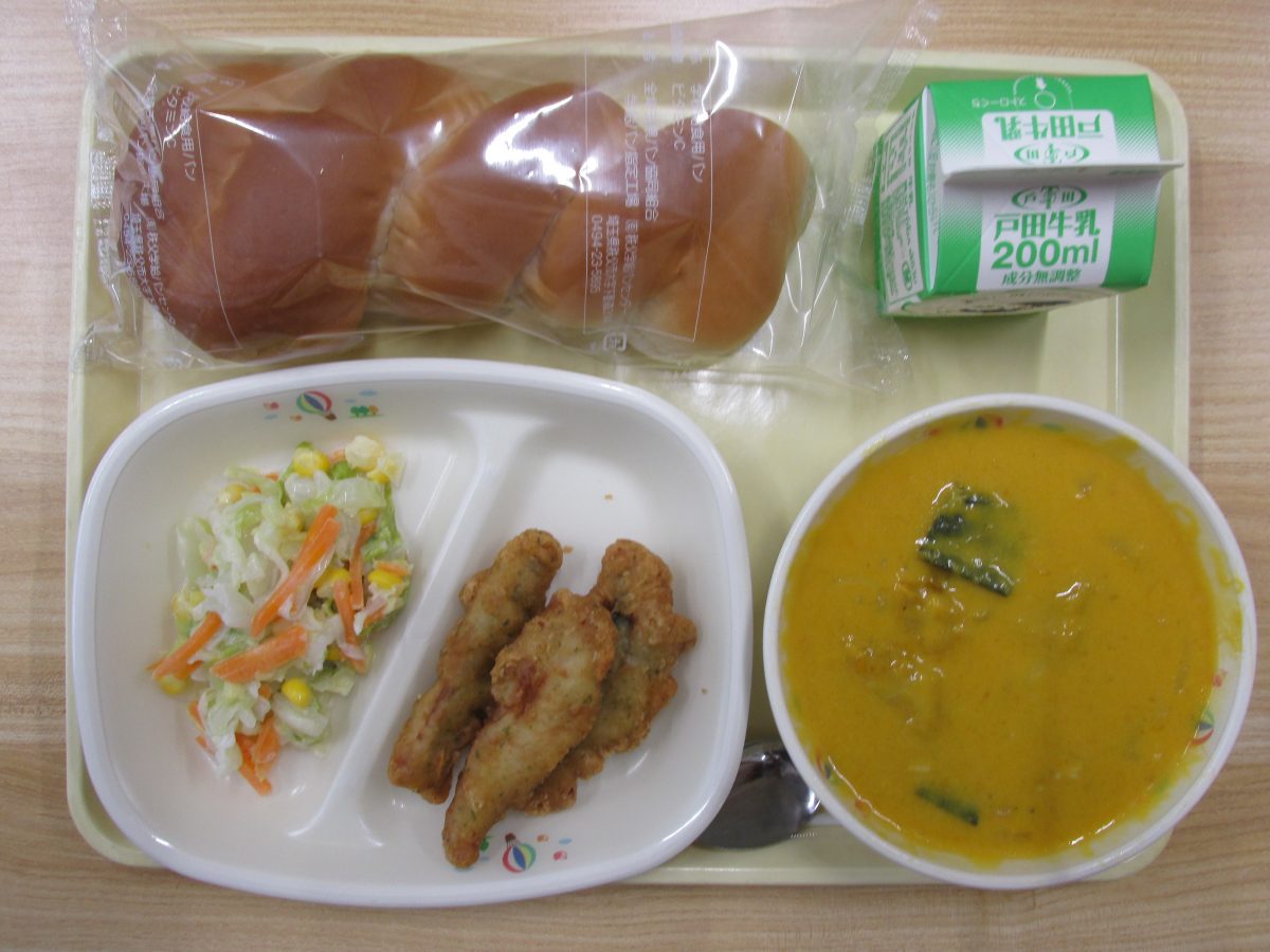 ツイストパン、あじフリッター、コールスローサラダ、パンプキンスープ、牛乳