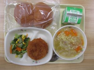 はちみつパン、ハムカツ(ソース)、ゆで野菜サラダ、ABCスープ、牛乳