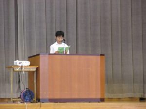 終業式では、各学年の代表生徒3名による振り返りの発表がありました。それぞれ、しっかりと振り返ることができていました。