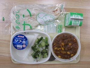 ナン、キーマカレー、グリーンサラダ、ヨーグルト、牛乳
