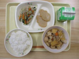 ごはん、厚揚げの五目煮、かまぼこのみりん焼き、ゆかりあえ、牛乳