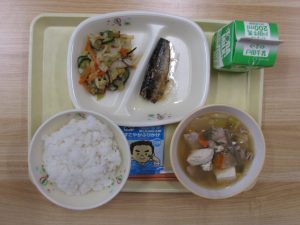 ごはん、わかめふりかけ、いわしのみぞれ煮、塩昆布あえ、豚汁、牛乳