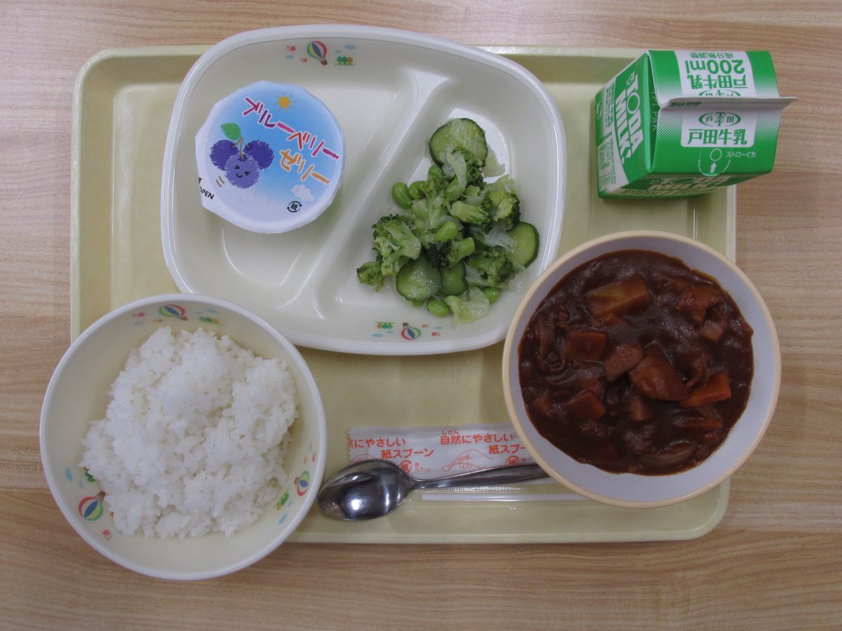 ごはん、トマトハヤシライス、グリーンサラダ、ブルーベリーゼリー、牛乳