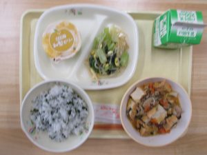 【本日のニュー】牛乳 わかめごはん 生揚げの肉みそ炒め 大豆もやしのナムル 和梨ゼリー
